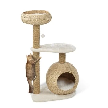 Sowohl die Höhle als auch die Stämme des AniOne Kratzbaums Saki sind aus natürlicher Wasserhyazinthe gefertigt, die dem Kratzbaum nicht nur sein hochwertiges und zeitloses Aussehen verleiht sondern zudem noch für eine hohe Luftdurchlässigkeit der Körbe sorgt. Auf den großzügigen Liegeflächen finden selbst größere Katzen bequem Platz. Die dazugehörigen Liegekissen bestehen aus kuschelweichem Plüsch und sind darüber hinaus einfach abnehmbar und waschbar. So schenkt der AniOne Kratzbaum nicht nur dank seines wunderschönen Aussehens und seiner natürlichen Materialien lange optische Freude sondern bietet Ihrer Samtpfote auch genau das was sie braucht: Verschiedene kuschelige Aussichtsplätze auf drei verschiedenen Ebenen und robustes, umweltfreundlicheres Sisal für ausgiebigen und langanhaltenden Kratzspaß.