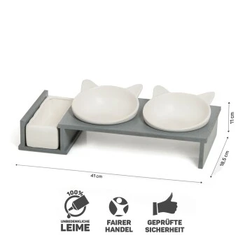 Katzennapf mit zwei Schalen mit „Kätzchenöhrchen“ und dritter Schale für z.B. Katzengras o. Trockenfutter aus Keramik mit Holz- oder Betonoptikständer
