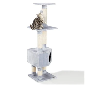 Dieser mittelgroße Kratzbaum dient als Schlaf- und Rückzugsort für deine Katze und regt zusätzlich durch die Plüschkugel den Spieltrieb deiner Katze an.