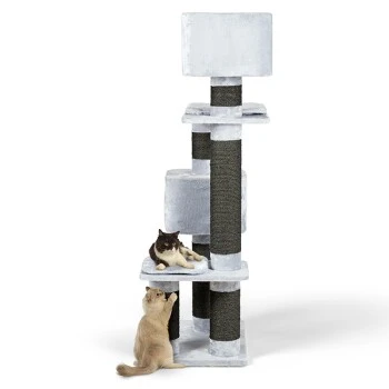 Der Kratzbaum hat fünf Ebenen, die komlett mit Plüsch überzogen sind. Er hat zwei Höhlen, die mit einem Plüschkissen ausgestattet sind, und zwei Liegebretter, die ebenfalls mit einem Plüschkissen ausgelegt sind. Alle Kissen werden mittels Klettband an den Liegebrettern und in den Höhlen befestigt. Die Kratzstämme haben einen Durchmesser von 14cm und sind mit robustem, natürlichen Sisal umwickelt und verklebt. An den Enden sind diese mit Plüsch unrandet.