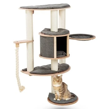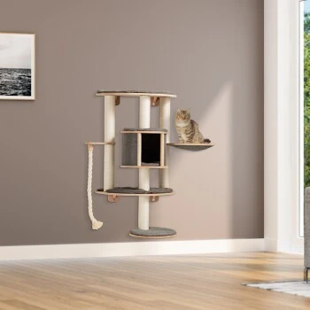 Der Kratzbaum wird an der Wand befestigt und bietet somit optimalen Halt. Die Kissen sind abnehmbar für eine leichte Reinigung. Ihre Katze kann sich an den Sisalstämmen die Krallen wetzen oder es sich auch einfach nur in der Hängematte bequem machen. Das Tau sorgt für zusätzlichen Spielspaß.