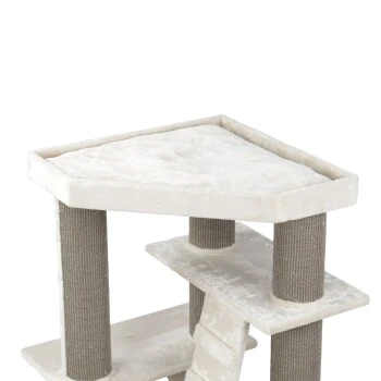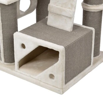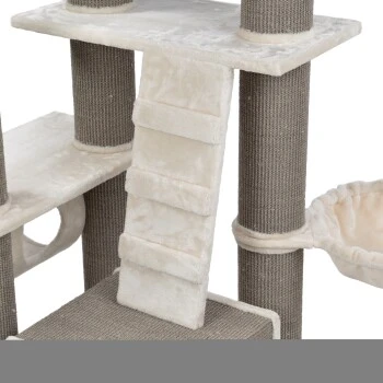 Der MORE Kratzbaum Anne vereint Design und Funktionalitäten in einer hochwertigen und modernen Bauweise. Vier unterschiedliche Ebenen laden zum ausgiebigen Entdecken und Klettern ein, während das robuste Sisal dem täglichen Kratzbedürfnis Ihrer Samtpfote entgegenkommt. Mehrere großzügige kuschelige Liegeflächen bieten ideale Voraussetzungen zum Entspannen und Beobachten. Die Kletterleiter lädt zum Bewegen und Erkunden ein, während die Hängematte den Spieltrieb weckt. Selbst größere Katzen finden mit dem stabilen MORE Kratzbaum Anne ausreichend Platz zum Kratzen, Entspannen und Spielen.